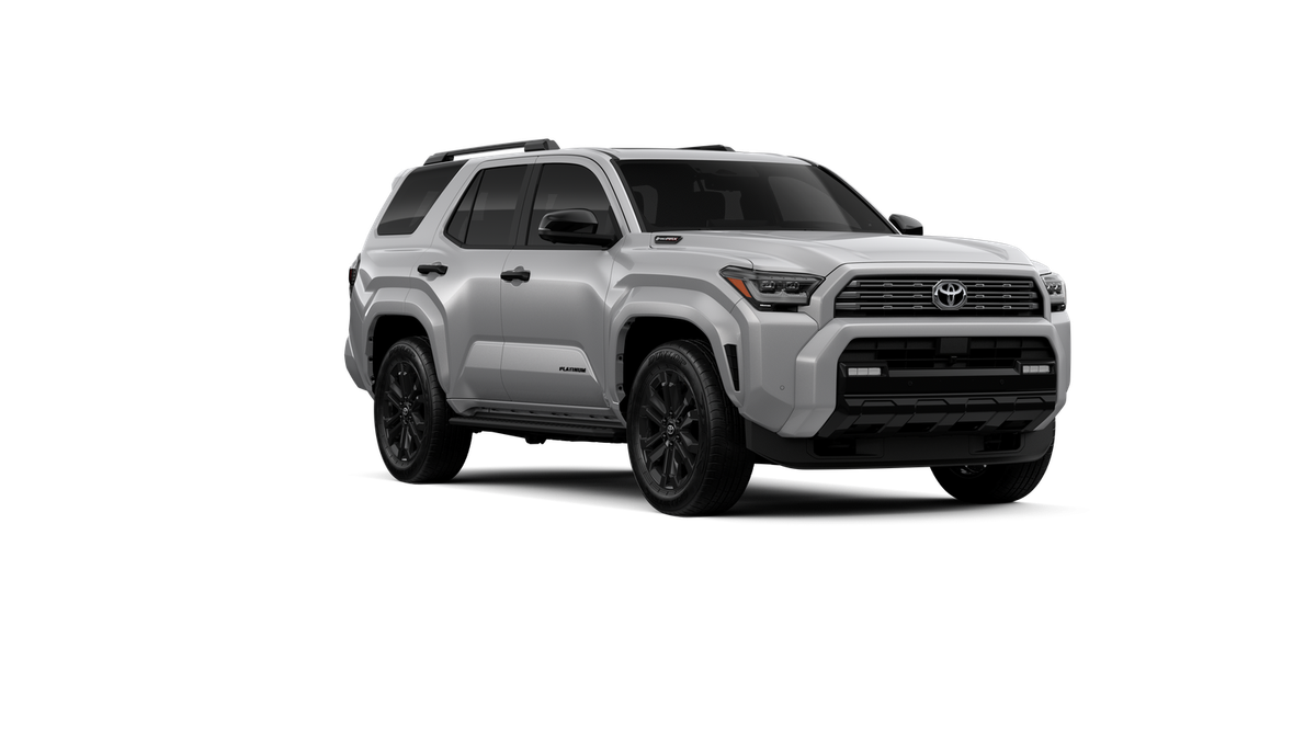 - Dark-chrome tri-bar grille; gloss-black mirror caps and door handles; color-keyed overfenders and rear spoiler; gloss-black "PLATINUM" and "4RUNNER" badges